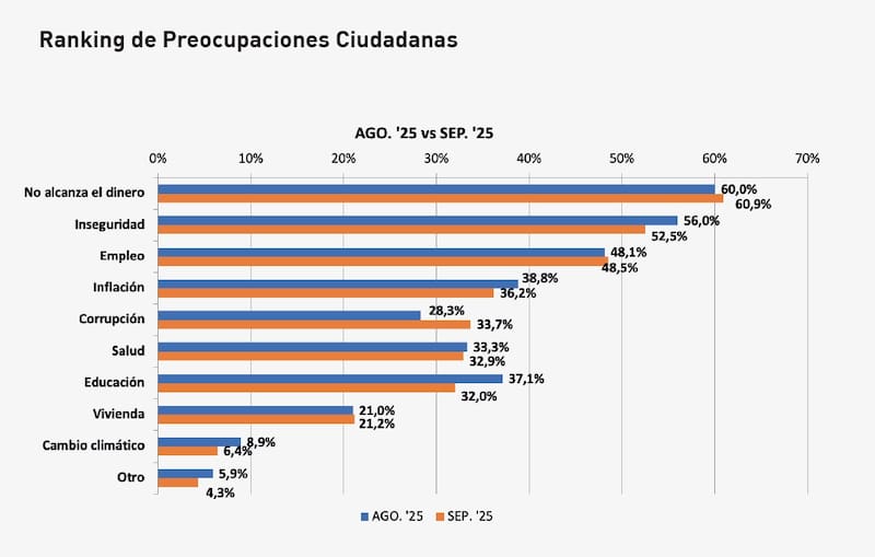 La contracara es que el descontento económico amplifica los efectos de la corrupción. La encuesta confirma que la principal preocupación sigue siendo el bolsillo: el 63,3% percibe su situación económica personal como negativa, un punto más que en agosto. A la vez, crece el pesimismo sobre el futuro inmediato: 47% cree que la economía estará peor en 2026, frente al 43% que sostenía esa mirada el mes pasado.