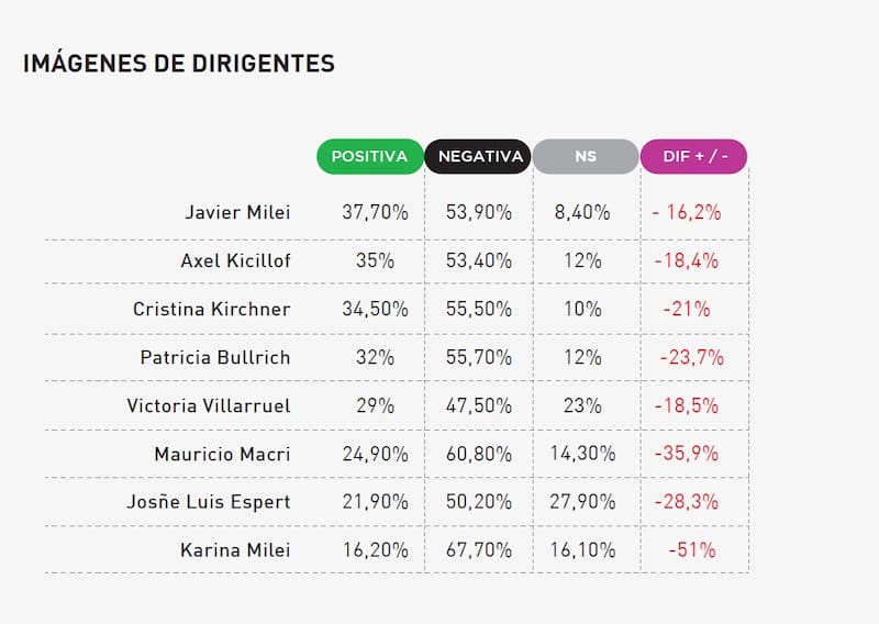 La crisis no solo afecta al presidente. Karina Milei, figura clave del dispositivo libertario, registra un desplome en su imagen positiva, que cae a 16,2%. Otros dirigentes del oficialismo también muestran retrocesos, entre ellos Victoria Villarruel (29%) y José Luis Espert (21,9%). En cambio, Axel Kicillof experimenta un salto de 8,6 puntos y se coloca por encima incluso de Cristina Fernández de Kirchner en niveles de popularidad.