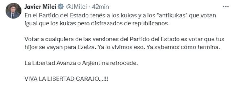 Minutos más tarde, Milei replicó el posteo de su ministro y armó el propio en X. "En el Partido del Estado tenés a los kukas y a los "antikukas" que votan igual que los kukas pero disfrazados de republicanos", escribió al dirigirse a la oposición dialoguista.