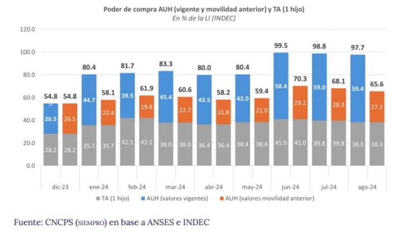El ejemplo que traen a colación es la AUH, que tuvo una duplicación del poder de compra entre el mínimo de diciembre de 2023 y el valor de 2024. El combo de la Asignación Universal por Hijo junto a la Tarjeta Alimentar servía para cubrir un 49% de la Canasta Básica Alimentaria (CBA, que contiene los productos básicos para la alimentación familiar); mientras que en agosto ese número fue de 92%.