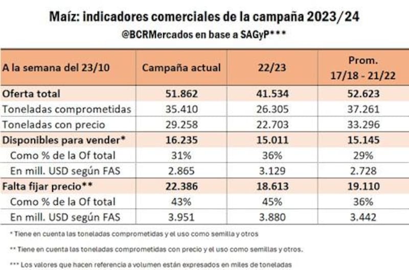 Así, expresado al tipo de cambio financiero, la pizarra por maíz ha llegado a valores máximos de todo el año. "El ritmo de compromisos durante el mes mantuvo la intensidad, llegándose a operar entre contratos y fijaciones 1,8 Mt hasta el 23/10", agregó el informe y marcó que en el cuadro general, las compras totales de la campaña ascienden a 35,4 Mt, dentro del promedio de los últimos años.