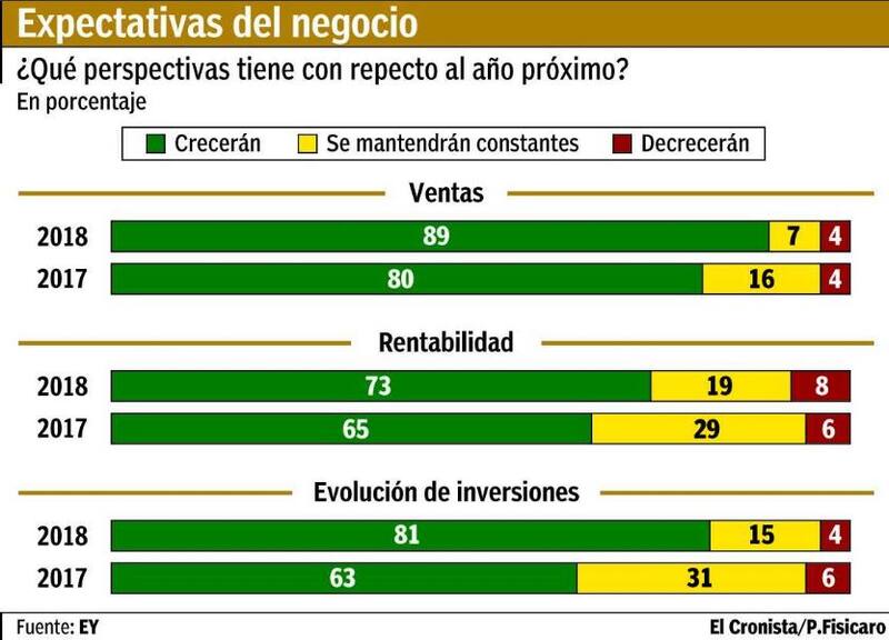 Así se desprende de una encuesta realizada y presentada ayer por la consultora EY Argentina en el marco de la 38´ convención anual del Instituto Argentino de Ejecutivos de Finanzas (IAEF) en Bariloche, entre responsables de 80 compañías de los principales sectores económicos locales. Según el relevamiento, 89% de los consultados prevé un crecimiento en sus ventas para 2018; mientras 81% estima que subirán las inversiones y 73% cree que mejorará la rentabilidad.