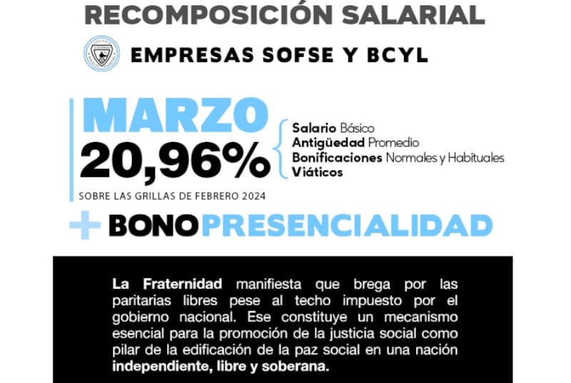 "La Fraternidad brega por las paritarias libres pese al techo impuesto por el Gobierno nacional. Esto constituye un mecanismo esencial para la promoción de la justicia social como pilar de la edificación de la paz social en una nación independiente, libre y soberana", manifestaron desde el combativo espacio sindical.