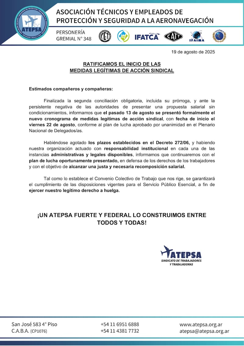 La Asociación Técnicos y Empleados de Protección y Seguridad a la Aeronavegación (ATEPSA), conocidos como los controladores áreos, anunció que, tras el vencimiento de la conciliación obligatoria sin solución a sus reclamos, iniciará un cronograma de medidas de fuerza que se extenderá durante cinco jornadas, con franjas horarias de hasta seis horas diarias. El paro afectará la operación de los vuelos comerciales, aunque no impactará en los vuelos sanitarios ni en el servicio de Búsqueda y Salvamento Aeronáutico (SAR).