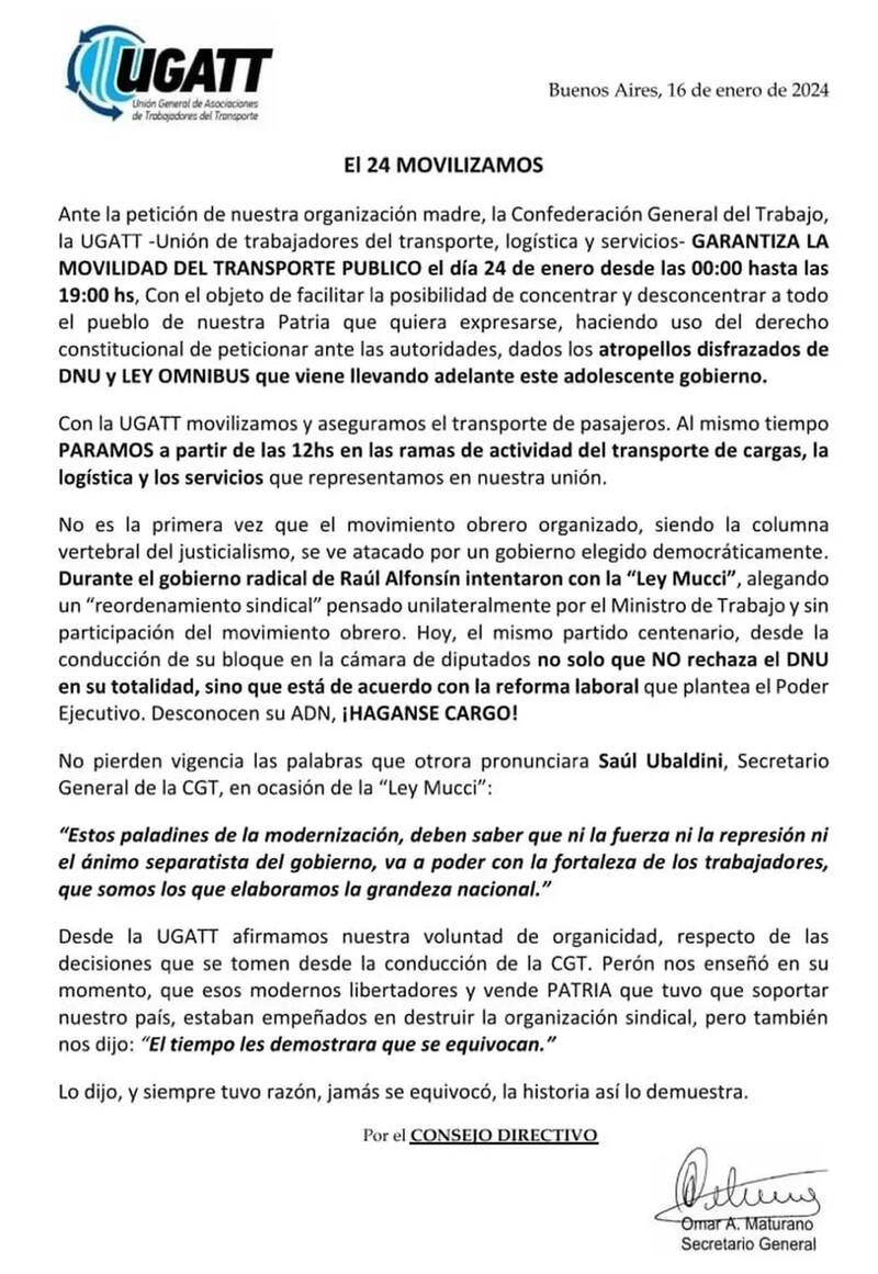 El transporte de carga, por su parte, sí hará paro todo el día, como manifestaron desde la UGATT: "Deberán suspender los servicios desde las 12 hasta las 24 del día 24 de enero de 2024.
