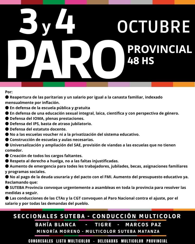 Por otra parte, le reclaman a SUTEBA Provincia que convoque "urgentemente a asambleas en toda la provincia para resolver las medidas a seguir, impulsando un petitorio", mientras que le exigen un Paro Nacional a las conducciones de las CTA y la CGT.