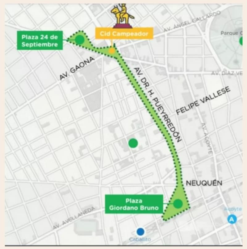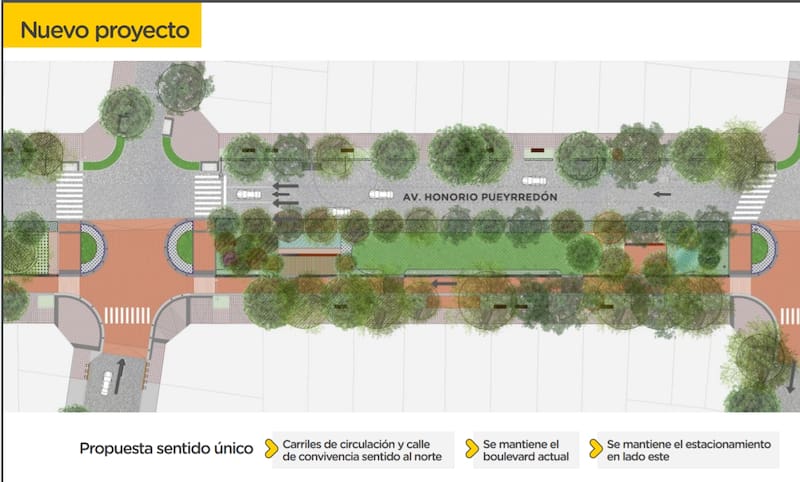 El nuevo parque lineal sobre la Avenida Honorio Pueyrredón, cuyo nombre será definido por los vecinos en una instancia posterior, conectará la Plaza 24 de septiembre con la Plaza Giordano Bruno.De los 8 carriles de la avenida, 3 de ellos (tránsito norte a sur) se convertirán en áreas verdes y un carril en una calle de convivencia (solo para los frentistas).