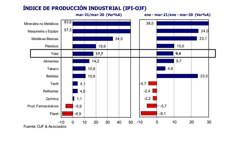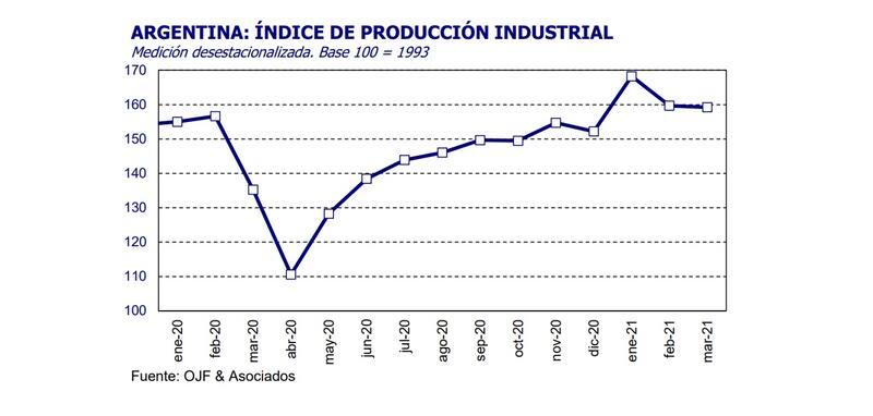 En marzo la producción industrial reportó un alza de 17,7% en la medición interanual según el índice que elabora Orlando J Ferreres & Asociados. Además, acumuló una expansión de 9,4% en el primer trimestre. En la medición desestacionalizada registró una contracción de 0,3% respecto de febrero.