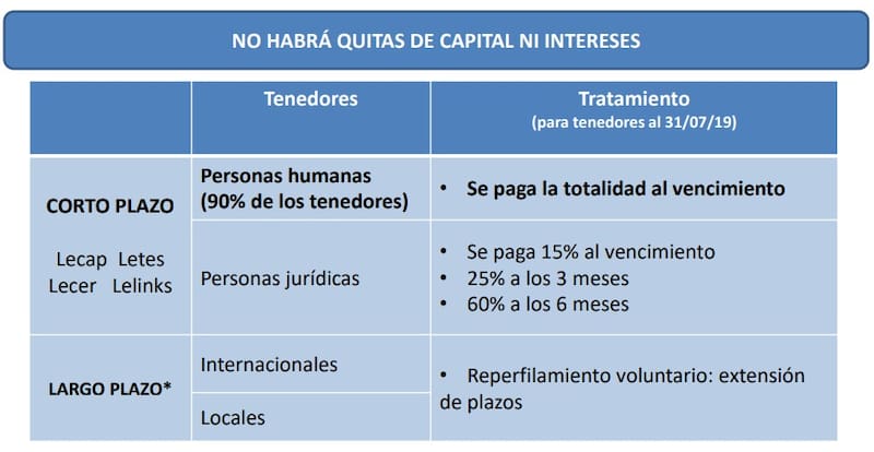 Se buscará, por un lado, extender el vencimiento de la deuda de corto plazo para inversores institucionales y no para personas humanas, que cobrarán la totalidad de sus acreencias en tiempo y forma. Sobre esos inversores a los que les extenderán los vencimientos entre 3 y 6 meses, Lacunza dijo que son alrededor del 10% y que también cobrarán sin quita.