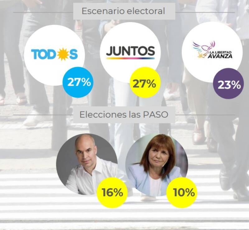 En cuanto a la competencia entre Horacio Rodríguez Larreta y Patricia Bullrich, en ambos escenarios simulados, Larreta se posiciona primero con una diferencia de 6-7 puntos porcentuales.