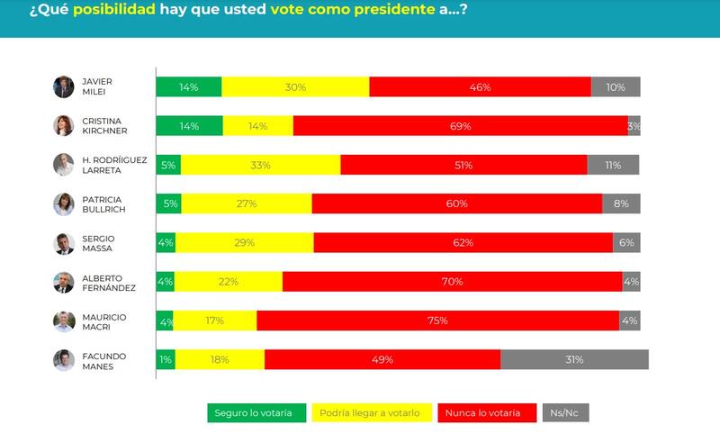 Por otro lado, Mauricio Macri, Alberto Fernández y Cristina Kirchner son los líderes políticos con el techo más bajo de voto. Un 75% de los encuestados indicó que nunca votaría por Macri, mientras que un 70% dijo lo mismo sobre Alberto Fernández y un 69% sobre Cristina Kirchner. Esto significa que tienen un gran porcentaje de la población que, por diversas razones, no los considera una opción viable.