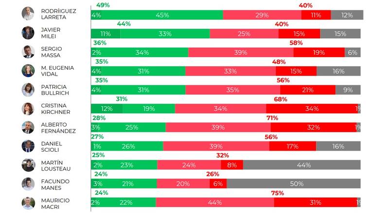 En cuanto a la imagen de los dirigentes políticos, Horacio Rodríguez Larreta es el líder con mejor imagen positiva (49%), seguido por Javier Milei (44%) y Sergio Massa (36%). Mauricio Macri, por su parte, es el político con mayor rechazo social (75% de desaprobación). Rodríguez Larreta y Javier Milei son, a su vez, los únicos líderes políticos que tienen una imagen más positiva que negativa. Esto significa que, en términos generales, la percepción de la población hacia ellos es favorable.