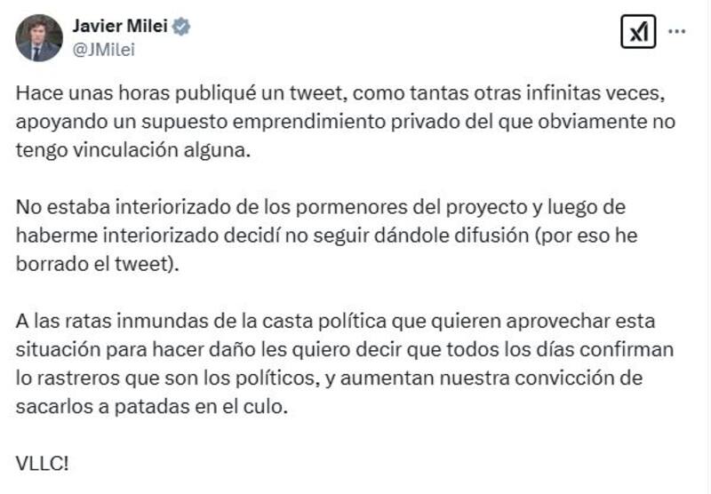 Horas después, Milei admitió haber publicado el mensaje, pero aseguró que "no estaba interiorizado de los pormenores del proyecto" y luego de hacerlo decidió "no seguir dándole difusión". Por eso, borró el posteo original donde promocionaba Libra.