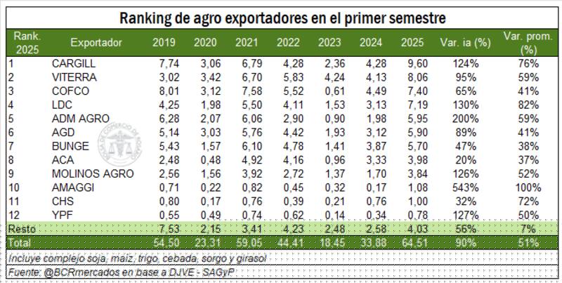Según la información oficial que procesó la entidad rosarina, la firma Cargill se quedó con el prime puesto en volumen de ventas al exterior, con 9,6 Mt. El podio lo completan Viterra y COFCO con 8,1 Mt y 7,4 Mt registrados, respectivamente.