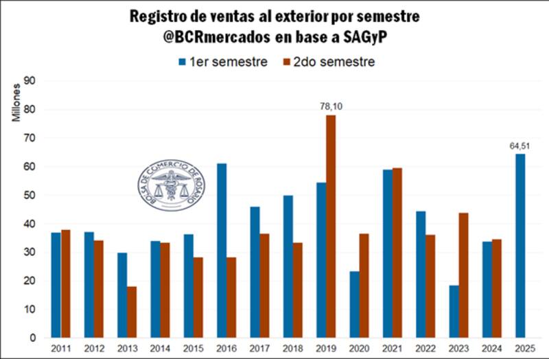 El único semestre que superó esta marca fue el segundo de 2019, impulsado por la guerra comercial entre China y Estados Unidos y el contexto electoral argentino, que generó un "adelantamiento excepcional de ventas externas", agregó la BCR.