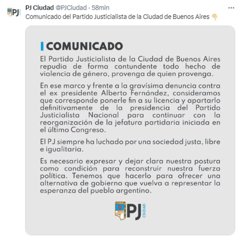"El Partido Justicialista de la Ciudad de Buenos Aires repudia de forma contundente todo hecho de violencia de género, provenga de quien provenga", se enfatiza al inicio del texto.