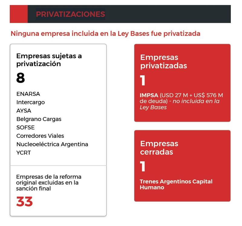 Por último, pondera el boomenergético, con la producción de petróleo en su mayor nivel en 30 años, y el inicio del proceso de privatizaciones, entre las cuales se cita el lanzamiento de procesos en ENARSA, Nucleoeléctrica, Belgrano Cargas y Aerolíneas, con avances limitados. No obstante, de las ocho firmas estatales incluidas en la Ley Bases, el reporte subraya que ninguna completó el proceso. En cambio, la empresa IMPSA fue privatizada con la venia de Mendoza, en manos de una parte de las acciones, y otra firma, Trenes Argentinos Capital Humano terminó liquidada.
