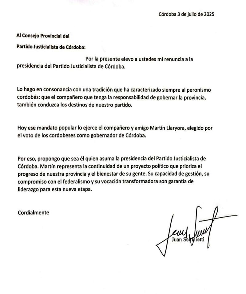 El exgobernador de Córdoba, Juan Schiaretti, renunció a la presidencia del Partido Justicialista y consolidó el armado del actual mandatario de la provincia Martín Llaryora al frente del peronismo cordobés. "Comparto la carta de mi renuncia a la presidencia del Partido Justicialista de Córdoba", indicó el exmandatario y cabeza del peronismo cordobecista formal hasta ahora a través de su cuenta de X.
