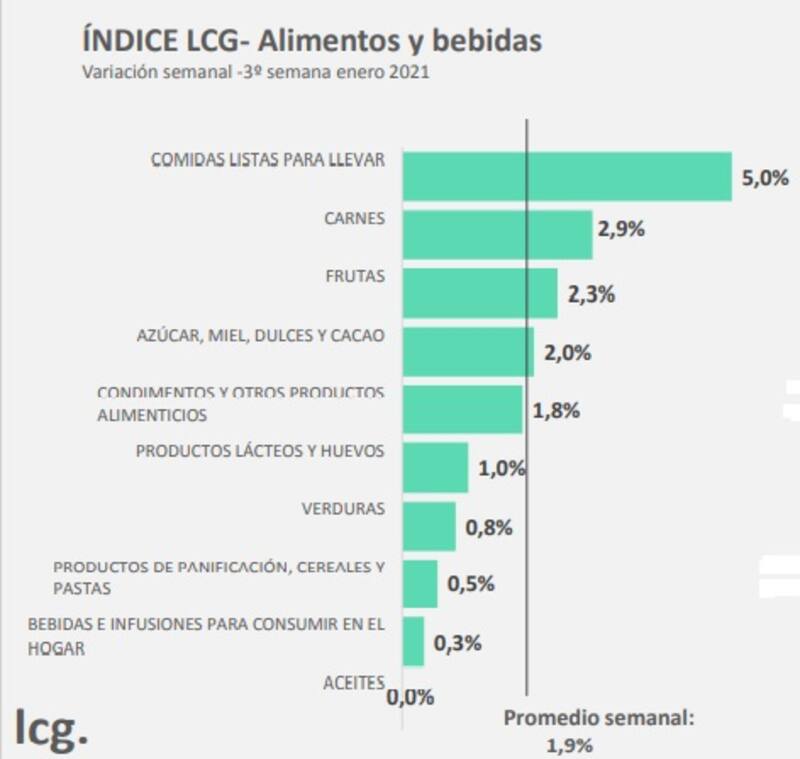Durante la tercera semana de enero los precios de los alimentos se incrementaron en promedio 1,9%, un avance de 0,8 puntos porcentuales respecto de la semana previa. Los datos corresponden al relevamiento semanal que realiza la consultora LCG.