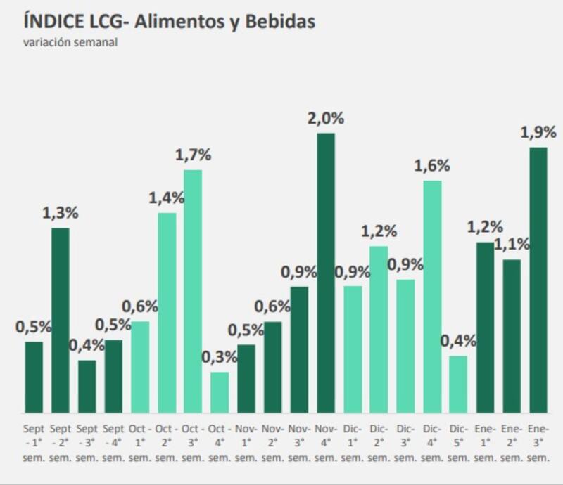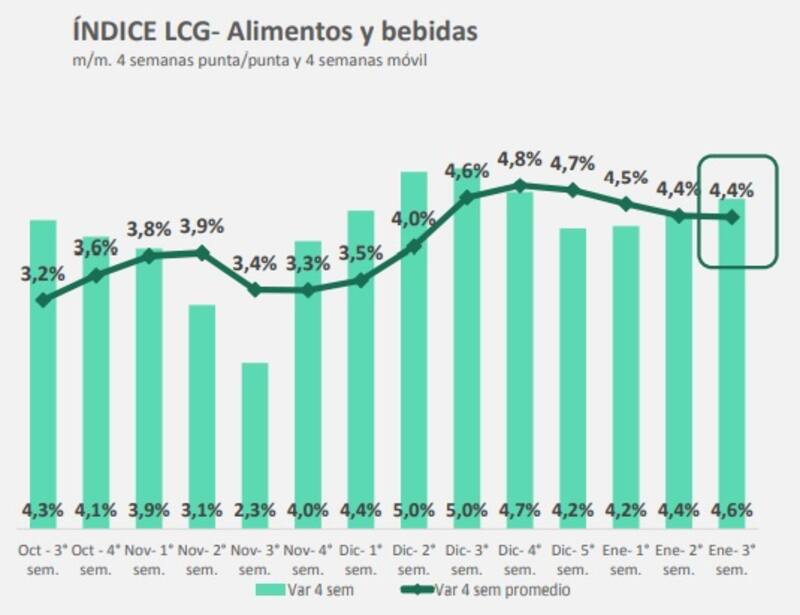 De esta manera, el índice de alimentos y bebidas en las últimas cuatro semanas registró un incremento promedio de 4,4%, con un panorama de precios muy caliente en el primer mes del año.