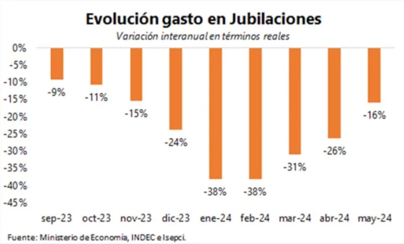 Al respecto, señalan que cuando "la inflación se acelera, los haberes profundizan su caída real". Así se refleja al comparar la evolución del gasto en dicho concepto, ya que en enero y febrero registró una caída real del 38%, mientras que en mayo la merma se redujo al 16%, en coincidencia con la desaceleración del IPC en los últimos meses.