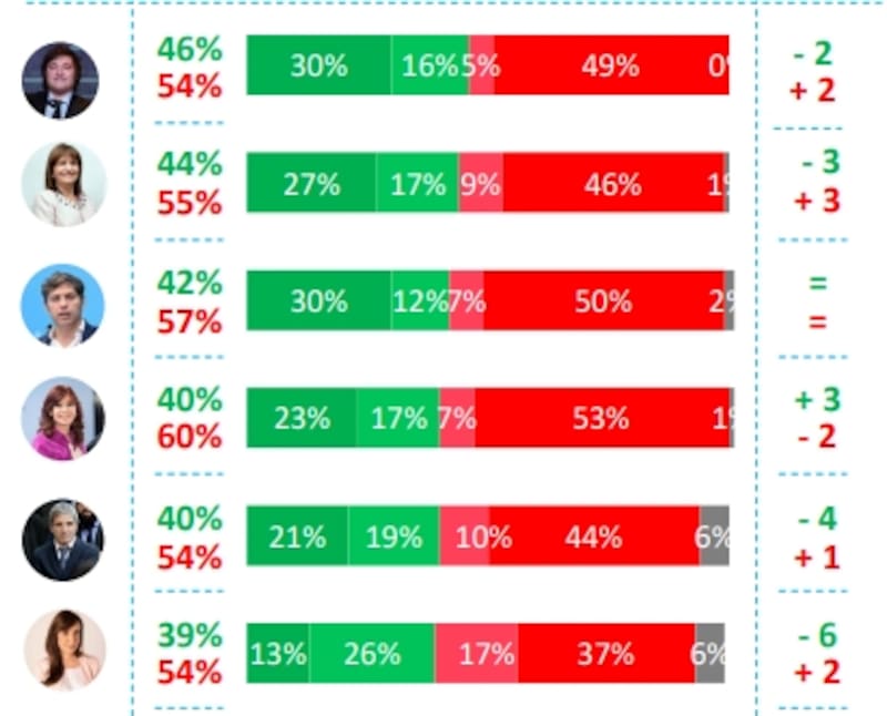 En la oposición, quien tiene mejor diferencial es el gobernador Axel Kicillof, pero con 42% de valoración versus 57% de imagen negativa. Su ahora contrincante interna, la expresidenta Cristina Fernández de Kirchner cuenta con 40% en "positivo" y 60% en "negativo", pero se destaca que creció más de 3 puntos respecto de la medición anterior.