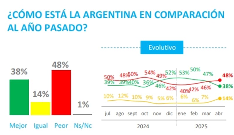Quizá el punto más llamativo de la encuesta es el desplome de casi 10 puntos en la percepción sobre la situación del país respecto del año pasado. Los encuestados por Opina Argentina que en marzo hacían una comparativa positiva respecto del año pasado sumaban el 47% y, este mes, se redujeron a sólo 38%.