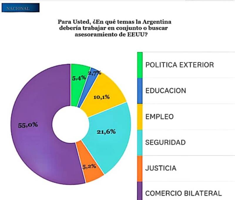 En esa línea, y entre quienes confían en que se abra una nueva etapa de cooperación entre los dos países, un 55% cree que el Gobierno argentino debe trabajar especialmente en todo lo que respecta al comercio bilateral, mientras que un 21,6% pide priorizar asesoramiento en materia de seguridad y un 10,1% en empleo.