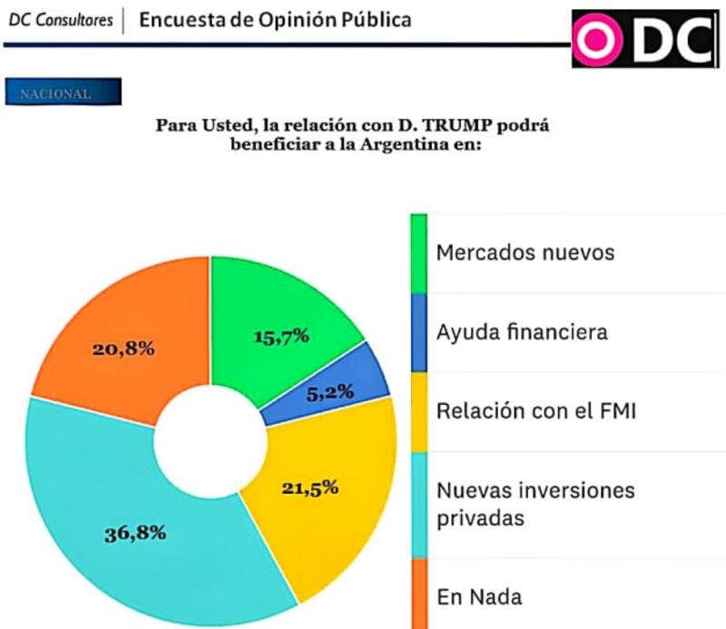 Toda esa confianza que el oficialismo y el mercado local deposita en el magnate republicano parece replicarse en la sociedad: un informe reciente de DC Consultora reveló que un 72,3% de los encuestados están convencidos que el triunfo de Trump beneficiará de alguna manera a la Argentina.