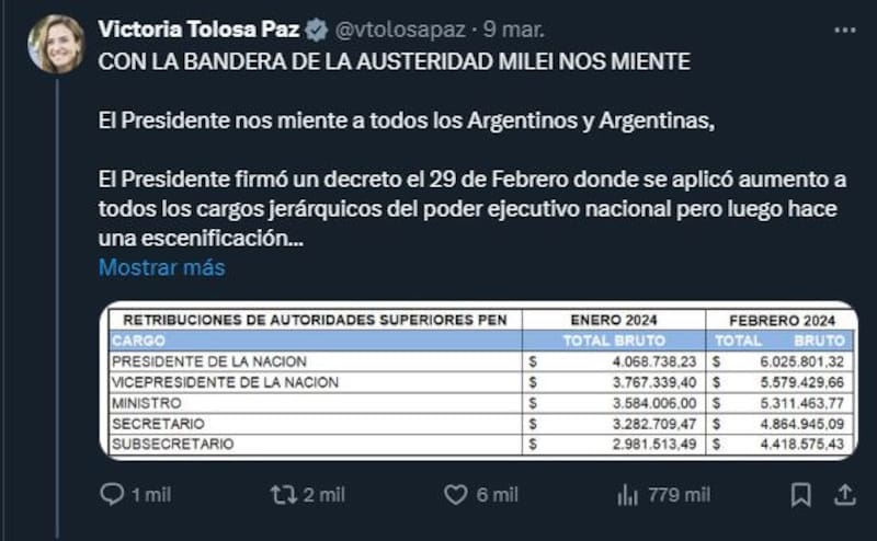 Además, la diputada nacional por Unión por la Patria, Victoria Tolosa Paz, había advertido el aumento del 48%, que deviene del incremento del 12% de la paritaria para los empleados públicos que perciben los cargos jerárquicos.