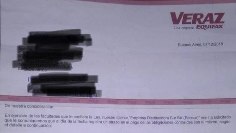 En concreto, la distribuidora de electricidad Edesur(que opera en Capital y el sur del Gran Buenos Aires) comenzó hace unas semanas a enviar intimaciones por Veraz para regularizar los pagos de sus usuarios, ante un aumento de la morosidad.