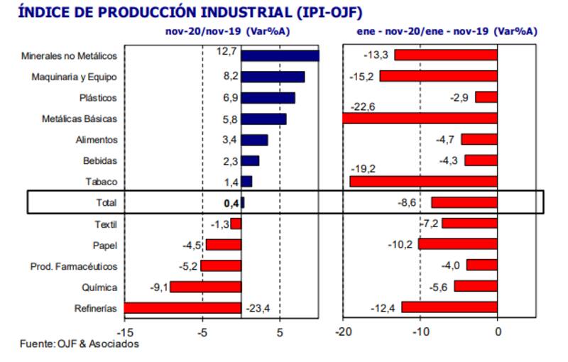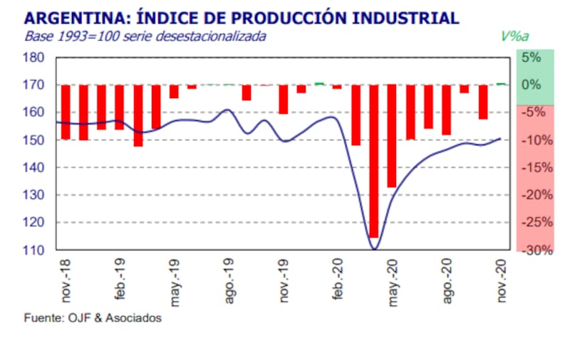 Según el Índice de Producción Industrial (IPI) que elabora el estudio Orlando Ferreres y Asociados (OJF), en noviembre se observó también una mejora del 1,7% en la comparación con octubre, al tiempo que el acumulado de once meses de este año muestra una contracción fabril del 8,6%.