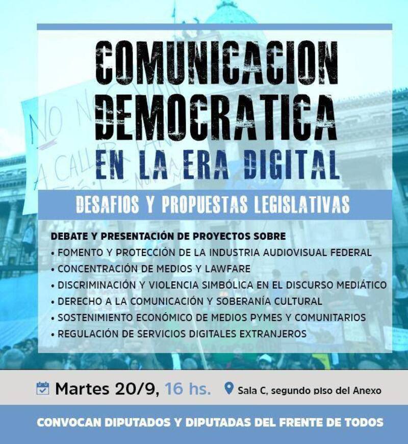 Bajo el lema "Comunicación democrática en la era digital, desafíos y propuestas legislativas", los diputados del Frente de Todos Florencia Lampreabe y Pablo Carro reflotan hoy, en un evento organizado en el anexo de la Cámara baja, un paquete leyes que buscan "revitalizar el debate por el derecho a la comunicación, retomando lo que ha sido el espíritu de la Ley de Servicios de Comunicación Audiovisual y la discusión por su pleno funcionamiento", en palabras de Lampreabe.