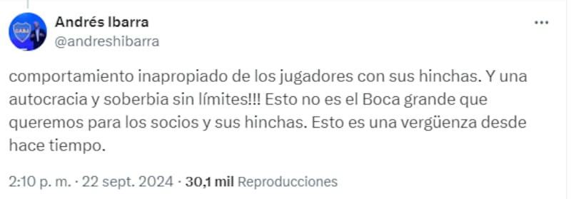 Y agregó que además hubo un "comportamiento inapropiado de los jugadores con sus hinchas. Y una autocracia y soberbia sin límites!!! Esto no es el Boca grande que queremos para los socios y sus hinchas. Esto es una vergüenza desde hace tiempo".