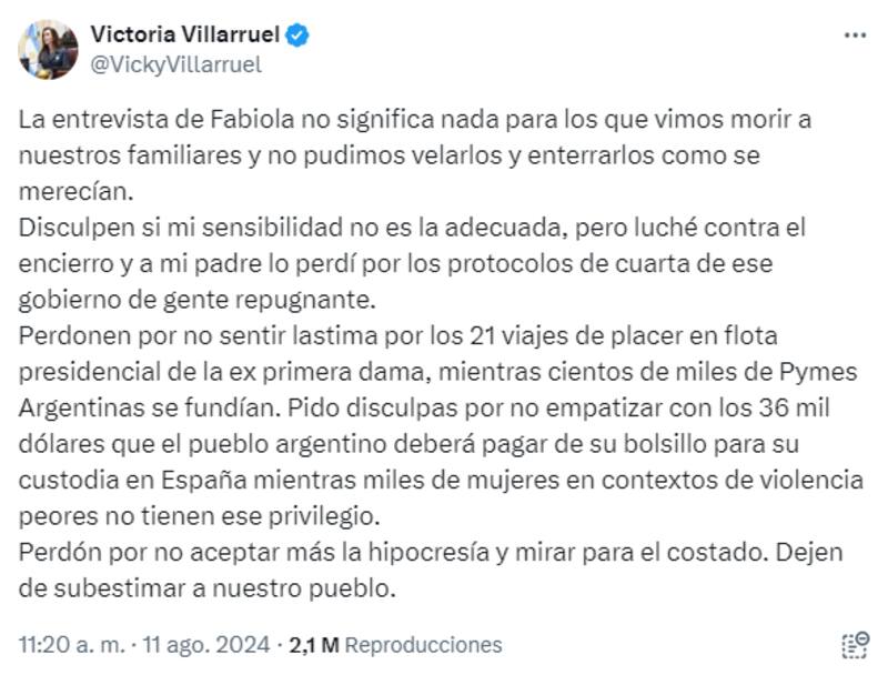 "La entrevista de Fabiola no significa nada para los que vimos morir a nuestros familiares y no pudimos velarlos y enterrarlos como se merecían", remarcó Villarruel a través de un posteo en la red social X.