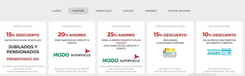 Por ejemplo, todos los lunes tendrán un 25% de descuento con Banco Ciudad, un 30% con Modo y Crédito Cabal Credicoop, un 25% con Ualá y un 20% con Banco Santander.