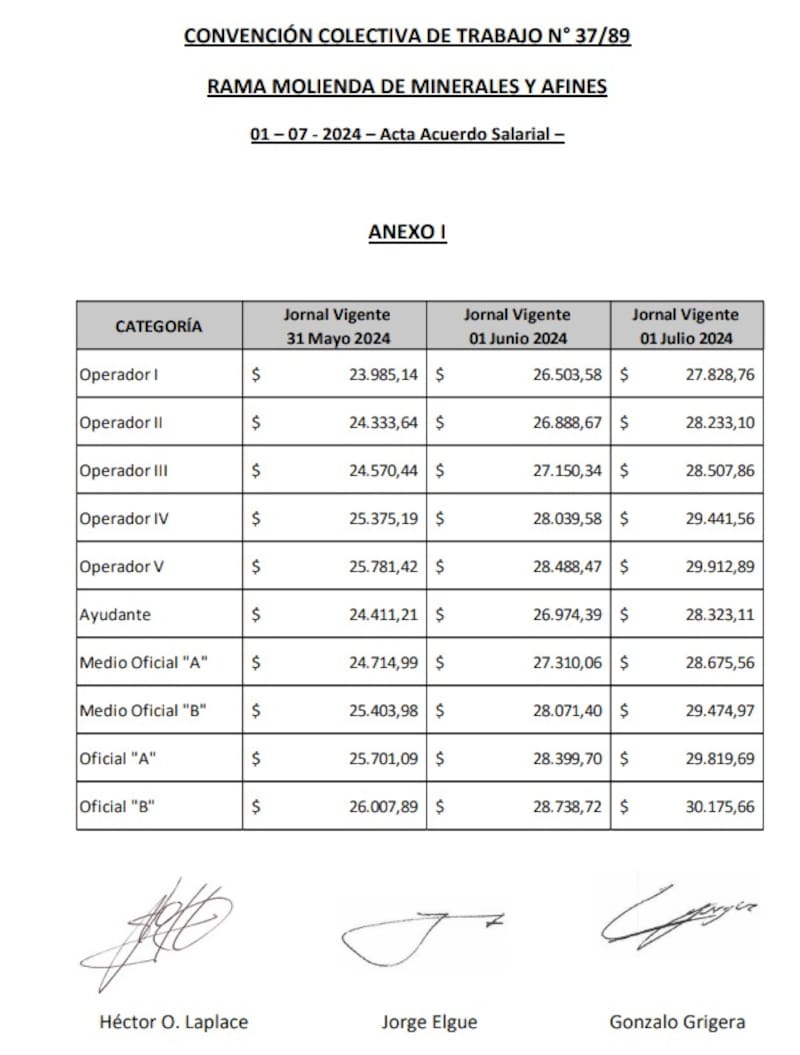La Asociación Obrera Minera Argentina (AOMA)alcanzó un nuevo acuerdo paritario con la cámara empresaria de molienda de minerales y afines estableciendo un aumento acumulativo del 10,5% para mayo y del 5% para junio.