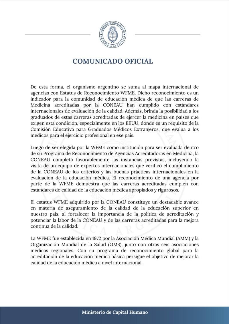 Desde el ministerio señalaron que "tras completar el proceso de evaluación ante la Federación Mundial para la Educación Médica, la CONEAU obtuvo el reconocimiento internacional como agencia acreditadora de programas de medicina".