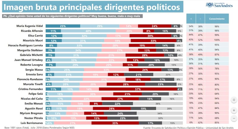 María Eugenia Vidal, la gobernadora de Buenos Aires, sigue siendo la dirigente política con mejor imagen, aunque su consideración cayó 20 puntos desde las elecciones legislativas de 2017, según un informe de Udesa, Universidad de San Andrés. En el listado de los principales referentes de la actualidad se mezcló Marcelo Tinelli, el mediático conductor de TV y empresario, que superó en imagen positiva, por ejemplo, a la ex presidenta Cristina Fernández de Kirchner.