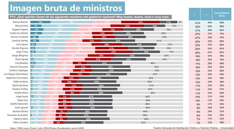 Lo lidera Patricia Bullrich, en cuanto a la imagen positiva (41%), aunque la ministra de Seguridad también es una de las funcionarias que genera más rechazos, con el 44%. Marcos Peña la sigue con el 32% de apoyos y el 43% de imagen negativa, lo que genera un diferencial de -11 puntos para el jefe de Gabinete.