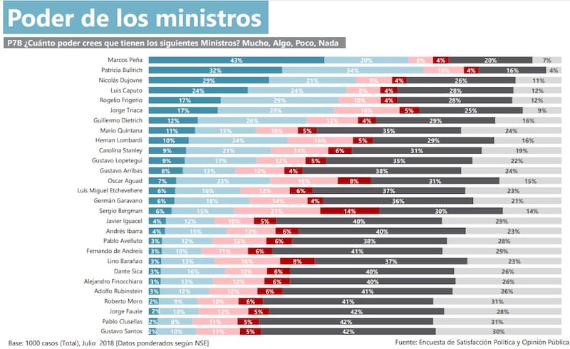 El ministro más poderoso, como en los últimos meses, sigue siendo Peña, de quien el 63% cree que tiene “mucho (43%) o “algo (20%) de peso en las decisiones de Gobierno. Luego lo sigue Bullrich y tercero apareced el jefe del equipo económico de ministros, el titular de Hacienda Nicolás Dujovne, con el 50%.