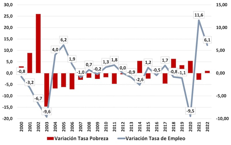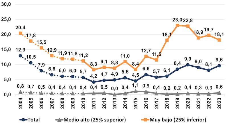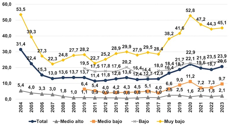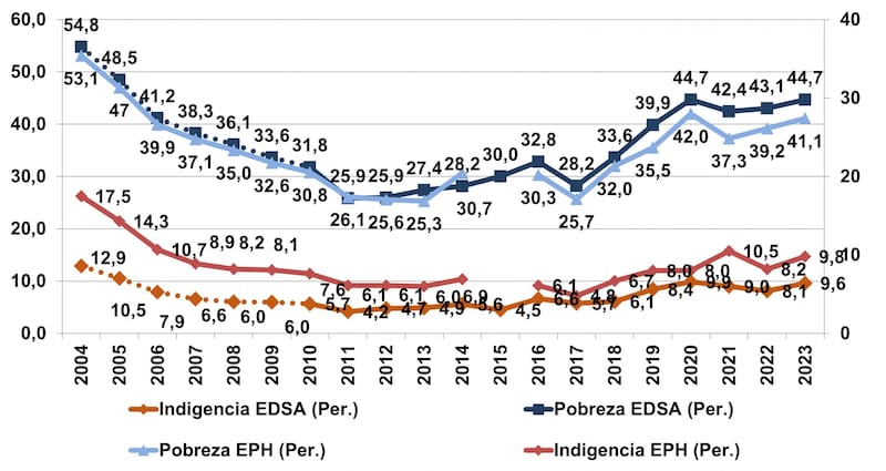Así, se destaca que la tasa de pobreza pegó más en los sectores muy bajos alcanzando el 68% mientras que en los sectores altos apenas llegó al 11% y en el promedio total alcanzó en el 2023 al 44,7%. Estos son índices que se vieron antes de la pandemia del COVID en el 2020 y son similares a los años de la presidencia de Néstor Kirchner en el 2004 y 2005.