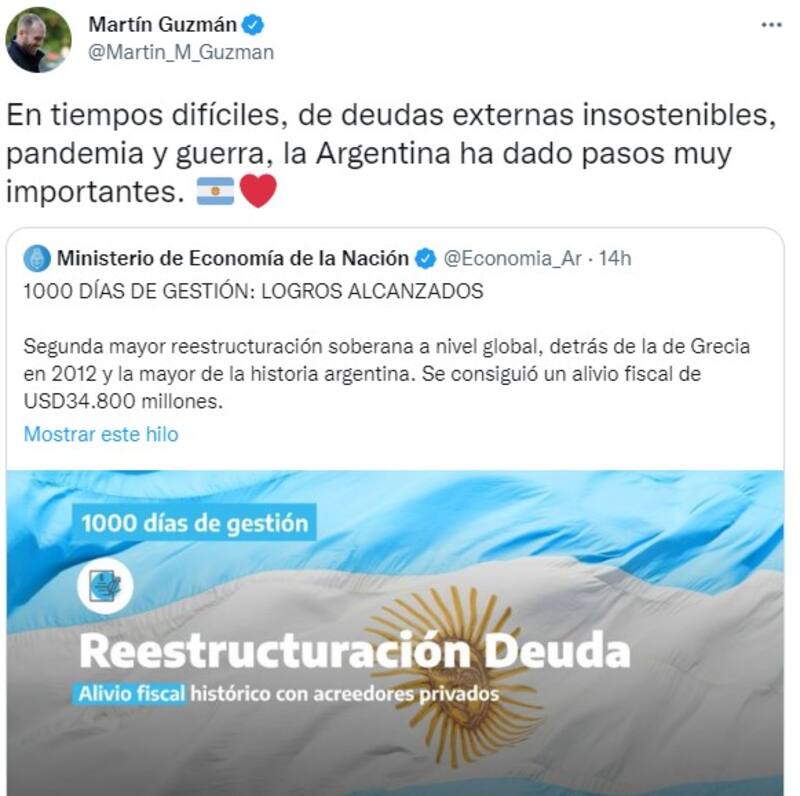 A raíz de un tuit del Ministerio de Economíapor los 1000 días de gestión del gobierno y los logros alcanzados durante este período, Guzmán agregó: "En tiempos difíciles, de deudas externas insostenibles, pandemia y guerra, la Argentina ha dado pasos muy importantes".