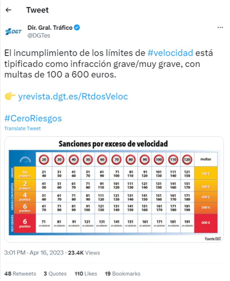 Por ejemplo, los conductores que superen la velocidad permitida en 20 kilómetros por hora, la multa será de 100 euros sin pérdida de puntos. Si pasan los 50 km la multa será de 600 euros y la pérdida de 6 puntos en el carnet de conducir.