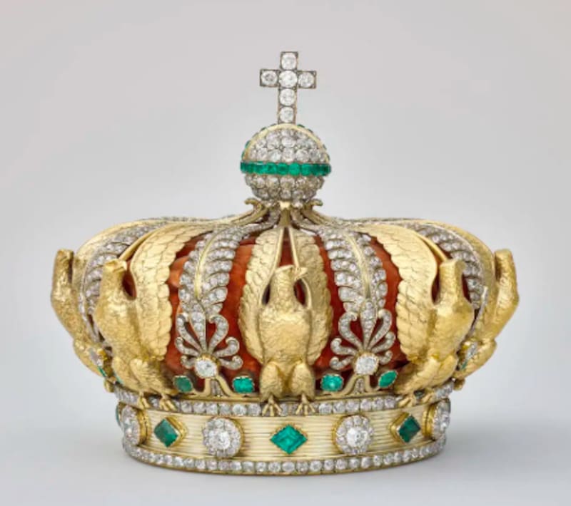 Se trata de una corona que lleva 1354 diamantes y 56 esmeraldas creada para la emperatriz con ocasión de la Exposición Universal de 1855, que tras el cambio de régimen a la III República, en 1870, fue vendida en 1885 por el Estado francés como una forma de liquidar su pasado monárquico y sólo volvió a su propiedad algo más de un siglo después gracias a una donación.