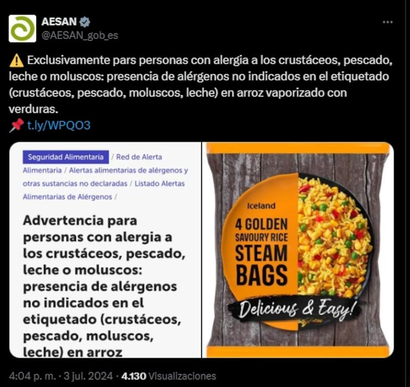 La razón de esta acción es la posible presencia de crustáceos, pescado, moluscos y leche, alérgenos que no se encuentran especificados en la etiqueta de composición, lo que podría representar un riesgo significativo para personas con alergias alimentarias.El artículo en cuestión es "4 Golden Savoury Rice Steam Bags“, de la marca Iceland, cuyo plazo de consumo preferente está fijado para el 16 de noviembre de 2025. Este producto se comercializa congelado en envases de 600 gramos y se recomienda a los consumidores que verifiquen sus existencias y eviten su consumo hasta recibir nueva información.