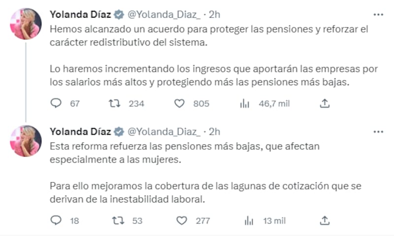 En un mensaje en Twitter, Díaz ha explicado que el acuerdo implicará el aumento de los ingresos aportados por las empresas a través de los salarios más altos, así como la protección de las pensiones más bajas, que afectan especialmente a las mujeres. La reforma buscará mejorar "la cobertura de las lagunas de cotización que se derivan de la inestabilidad laboral".