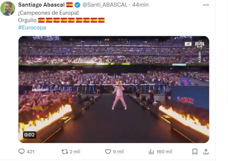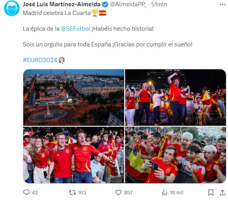 "¡La #EURO2024 es nuestra! ¡Es para España! He estado viendo la final en la plaza de Colón de Madrid con miles de españoles orgullosos de nuestra selección y de sus ganas de ganar", ha escrito en sus redes Alberto Núñez Feijóo.