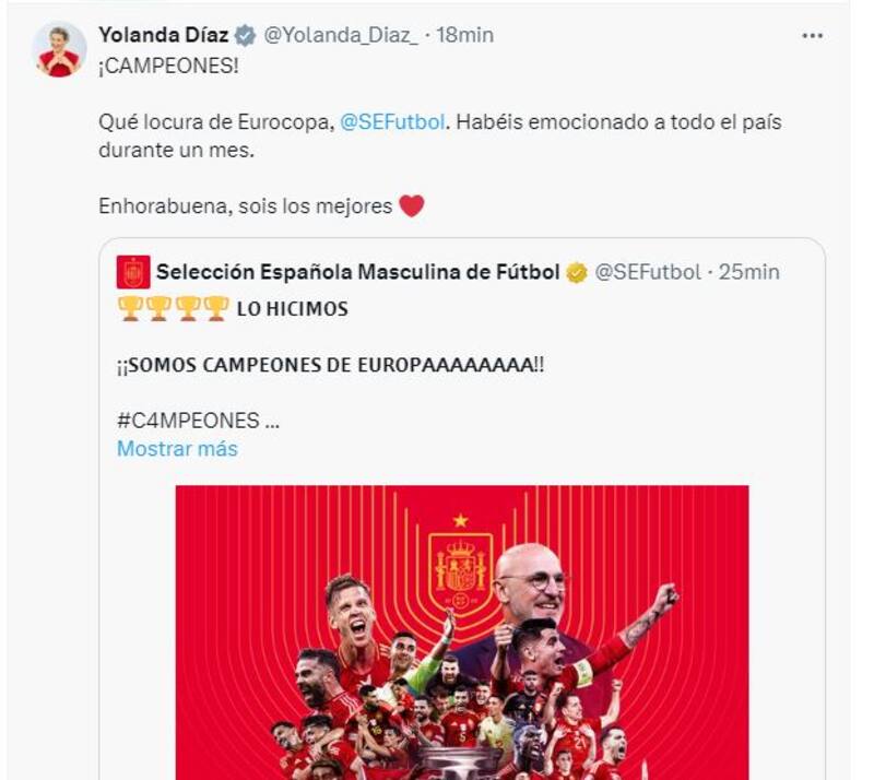 Yolanda Díaz ha sido de las primeras integrantes del Gobierno en publicar en las redes sociales tras el triunfo de España. "¡CAMPEONES! Qué locura de Eurocopa, @SEFutbol. Habéis emocionado a todo el país durante un mes. Enhorabuena, sois los mejores", expresó la ministra de Trabajo.