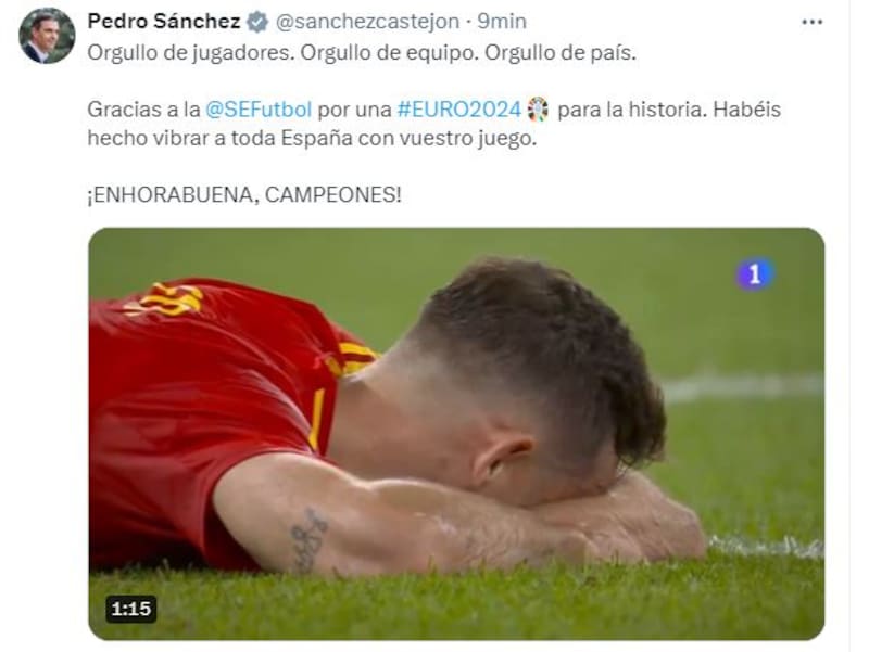"Gracias a la @SEFutbol por una #EURO2024 para la historia. Habéis hecho vibrar a toda España con vuestro juego", agregó. "¡ENHORABUENA, CAMPEONES!", cerró el mensaje el titular del Ejecutivo.